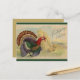 This postcard features a vintage illustration of a brightly-coloured turkey and haystacks. A road curves past the big fellow and you see mountains in the background. The card reads, “A Thanksgiving Greeting” in a beautiful script font.