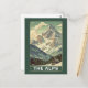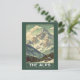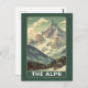 Escape to the mountains with this classic 'The Alps' Vintage Travel print. This Mid-Century Modern illustration captures a majestic, snow-capped peak rising above a valley, complete with a cozy ski lodge cabin nestled among the pine trees.