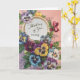 A vintage greeting card image that says "Thinking of You Today" inside an image of embroidery hoop. Surrounding the hoop are beautiful pansies in white, yellow, purple and lavender. The message inside the card is "Just sending this note to keep in touch and say I miss you ever so much."