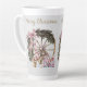 Vintage Three Gnomes and Wagon Wheel Latte Mug. This adorable design has three cute gnomes having coffee getting ready for their day. In the background sets a vintage wagon wheel decorated with evergreens and pink ribbons. Edit the greeting and family names to your own choices. If desired, you can change the background colour to match your holiday decor and style.