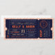 Bold fonts decorate this vintage inspired ticket. Perfect for any event hosted in a historic union station or theatre. Shown in shades of Navy Blue, Peach and Coral (a Pink-Orange hue). Add in your names, venue information and wedding date to announce your big day in style! To further customise (changing fonts and/or colours) click the orange 'customise it' button, above.