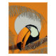 This vibrant illustration features a striking toucan perched on a branch against a bold orange backdrop, showcasing its colourful beak and tropical plumage within a stylised jungle scene, perfect for nature-themed art prints and designs.