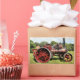 A photographic design of a red vintage steam traction engine.