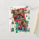 An adorable Christmas card with a warm cosy vintage vibe. It is a two photos template. You can upload your holiday family portrait in the personalise area. The background is cute little red and green Christmas trees and trains. The card is in soft vintage green, off white and red.