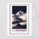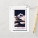 postcard with a vintage poster travel ad for Austria. A landscape illustration of snowy hills and mountains with a secluded cabin.