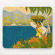 Vintage travel poster for Jamaica, the gem of the tropics, showinga woman standing before a body of water carrying a fruit basket on her head. In the background, mountains and a village. circa 1910.