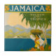 Vintage travel poster for Jamaica, the gem of the tropics, showinga woman standing before a body of water carrying a fruit basket on her head. In the background, mountains and a village. circa 1910.
