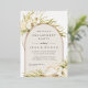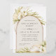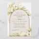 Tropical chic engagement party invitations in an alluring neutral color palette feature a rose gold foil arch bearing your engagement party details, accented with pale green watercolor palm fronds, beachy island foliage, white orchids, boho dried botanicals and pampas grass.