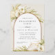 Tropical chic engagement party invitations in an alluring neutral colour palette feature a rose gold foil arch bearing your engagement party details, accented with pale green watercolor palm fronds, beachy island foliage, white orchids, boho dried botanicals and pampas grass.