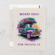 A festive watercolor illustration of a vintage truck decked out in classic Mardi Gras colours of purple, green, and gold. The truck is filled with iconic Mardi Gras items, including colourful bead necklaces and decorative masks. The scene is set with the truck parked on a street with charming building details, all set against a pure white background. Perfect as clipart for Mardi Gras invitations, party decorations, DIY crafts, or festive designs celebrating the spirit of the season!