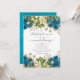 Turquoise - teal and gold shabby-chic flowers first holy communion invitation with accents of ivory white and elegant handwriting typography.