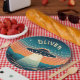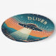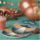 This eye-catching personalised paper plate features a vintage scene of a UFO soaring through a mesmerising sunset. Stars twinkle in the dark upper sky, while the fiery orange horizon casts a dramatic silhouette on the landscape below. The UFO itself acts as a beacon, illuminating the land with its bright light.