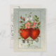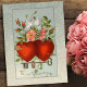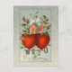 Beautiful and romantic antique design featuring two red hearts surrounded by pink wildflowers and a key holding a ring on subtle engraved teal floral background.