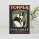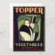 Vintage illustration love and romance art deco vegetable product crate label art advertisement featuring an elegant couple. The woman is wearing a fancy dress and the gentleman is wearing a dapper tuxedo and top hat. Antique advertising for Topper brand canned vegetables. LK Small Company, main office Los Angeles, California, USA.