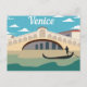Classic Vintage Venice & Venetian Gondola Silhouette Postcard. This print features an illustrated view of Venice. From the water you can see a Silhouette of a Venetian Gondola floating in front of a bridge in the distance. You can see the tops of some of the buildings. It appears to be a sunny day with blue skies. Supreme Customs Art & Design Studio.
