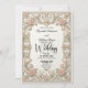 Set the tone for a romantic union with this Victorian-inspired design, featuring soft pastel florals and elegant swans framed by an ornate architectural border.This design features a sophisticated formal layout anchored by a symmetrical border that simulates the look of 3D carved stone. Swirling acanthus leaves and filigree in beige and cream tones create a classical frame around the central text. At the header, two white swans curve their necks to form a delicate heart shape, nestled among soft pink roses, tulips, and sage green foliage. The typography hierarchy combines an elegant black calligraphy script for names with a traditional serif font for event details, ensuring high readability against the clean cream background.