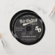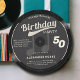 An elegant, music themed, fun birthday party invitation template in the shape of a vinyl record with musical notes, that features a textured black and grey background and the title "Birthday Party" in groovy, 70s style lettering. You can fully edit this template. A perfect birthday party invitation for a man who loves rock, music and guitars, on his 50th! Dad, husband, grandpa...