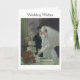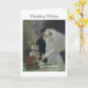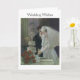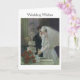 A vintage illustration of a bride and groom cutting the first slice of their wedding cake. The front of the card says "Wedding Wishes" and the message inside the card is "Wishing you many more days as happy as this one, many more occasions for celebration, and a lifetime of love and laughter."