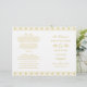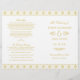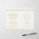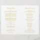 Ornate gold art deco patterns frame "The Wedding Of" on a crisp white background for a ceremony program dripping with vintage glamour. Geometric borders and elegant typography evoke the sophistication of a bygone era, with a coordinating art deco backing design. Inside pages are fully customizable for your bridal party, ceremony order, and a personal thank you message on the back cover. Programs are printed on text-weight paper and arrive flat, requiring a simple center fold.