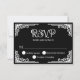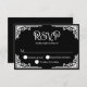 A matching RSVP card designed in the Cinematic Vintage style and white and black with subtle filmgrain/dust overlay. Completes your editorial wedding suite with a cohesive, nostalgic look. Fully editable. The card has a decorative frame and vintage font in white on a black background.