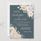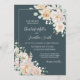A vintage floral style invitation for your spring or summer wedding with delicate creamy white and blush flowers, pastel greenery, navy blue background and modern handwritten style text.