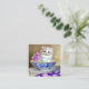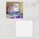 Enclosure Cards featuring a fluffy white kitten! The blue eyed kitten sits in a blue bowl with pink flowers. A purple flowered blanket is draped in front. A marvellous gift for cat lovers and Victorian art enthusiasts!