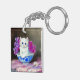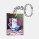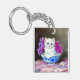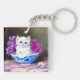 Keychain featuring a sweet white kitten! This fluffy cat poses in a blue bowl decorated with pink flowers. A wonderful gift for cat lovers and Victorian art enthusiasts!