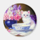 Magnet featuring a beautiful white kitten wearing a purple ribbon! This fluffy kitty poses next to a blue bowl and a vase of pink, purple, and white flowers. A marvellous gift for cat lovers and Victorian art enthusiasts!