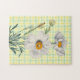 My original artwork is featured on this floral puzzle, consisting of a green and yellow watercolor plaid background and a vintage illustrated pair of white poppy flowers. The size of this unique flower puzzle is 11” x 14”, and in the ‘challenging’ category, however you may size up or down as desired.
