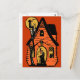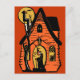 A cute, vintage, Halloween Illustration of an old witch, standing in the doorway, or her house, which is orange and black. In the window, you can see the witch's black cat. Behind the chimney, the full moon is visible and there is a black bat, flying across it.