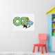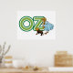 Large text letters that spell the word 'OZ' with the little girl Dorothy in a retro blue gingham dress and her pet dog Toto.