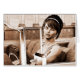 3D digital render of a beautiful young vintage woman sitting in a car on a background of a summer city