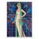 Lovely vintage fashion illustration from a French magazine. Woman in long white gown with green headband and sash. She's standing in a grape arbor. Background is blue.