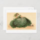 This postcard is a reproduction of a vintage Victorian trade card showing a woman with green hair wearing a dress made of lettuce or cabbage.