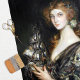 Depicts an elegant vintage woman with red hair holding a silver ship in her hands.