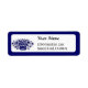 A custom return address label with vintage woodcut art of a basket of daisies and other flowers, on a white background and a blue border.