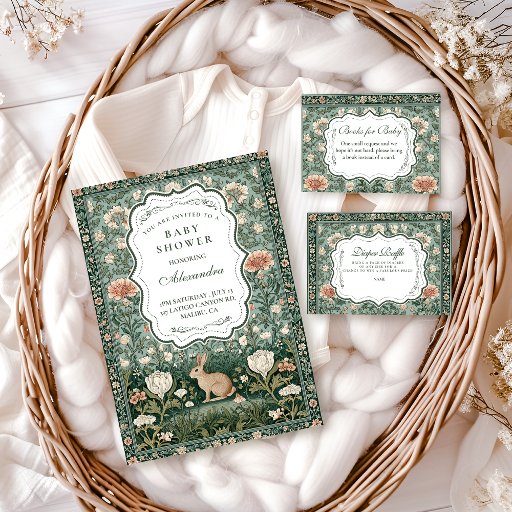 This baby shower design features a classic woodland illustration with a gentle bunny nestled among lush florals and greenery, inspired by vintage botanical and storybook art. The deep green palette, ornate floral border, and soft antique details create a timeless, cozy aesthetic with an old-world charm.
