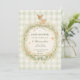A soft woodland baby shower design featuring a delicate watercolor fawn standing above a floral forest wreath. Gentle greenery, tiny mushrooms, and wildflowers surround the center, while a soft sage gingham background and ribbon bow add a cozy countryside nursery feel. The vintage storybook illustration style and muted woodland palette create an elegant and whimsical design perfect for a nature-inspired celebration welcoming a new baby.