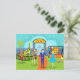 This Vintage Zoo Postcard shows a 1950's, classic television style family on a weekend excursion. This mid century modern, minimalist art design features a cartoon drawing of a perfect day at the zoo. Yes, it's a beautiful day for a family outing and you've come to the right place. Step through the wrought iron gate, beneath the yellow sign with red lettering that says, "ZOO." Once inside, you'll see an orange, stone pathway flanked by lush, green grass. In a large cage, you'll notice the majestic lion. This orange and yellow king of the jungle is keeping his eyes on an adorable, blonde girl in a pink dress, who, coincidentally, is keeping her eyes on him. On the opposite side of the walkway, you can't miss the towering, yellow and brown giraffe in a round enclosure. He is at eye level with the swaying palm tree in the background. A young, boyish scamp wearing a bright, red shirt and blue jeans is in a hurry to get somewhere. Oh, my! It looks like he's making a beeline to a zookeeper. The keeper of the zoo is dressed appropriately in khaki shorts, shirt, and hat. What's that he's holding? A monkey! And what's that the money is holding? A banana! Folks, it does not better than this! Standing on the walkway, we see Dad. Whew! I'm glad to see he knows it pays to look your best, even on a day off from the office. He is wearing a blue suit, light blue shirt and red tie. Dad is handing off three balloons, in shades of orange, blue and red to Mum. Mum is wearing a blue dress with a form fitting bodice and flared skirt. Her flippy, blonde hairstyle is most becoming. The sky is shades of aqua, teal and blue and is filled with magical, white stars. Just like the zoo itself, this design is fun for the whole family and is perfect for children of all ages.