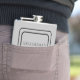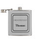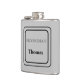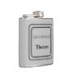 Vinyl wrapped flask is shown in a solid colour of silver with black colour text with a sample groomsman name.