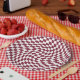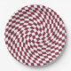 Modern bohemian dark burgundy red colour theme wedding party products. Evergreen retro trendy warped checks design, warped chequered paper plates in beautiful elegant and chic dark burgundy red and white colour.
