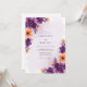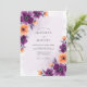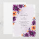 This vibrant design features a wash of ethereal lavender watercolor as a backdrop for bold floral arrangements. Deep purple anemones with dark centers are paired with delicate apricot and orange blossoms. The painterly style creates a romantic and artistic mood, perfect for a lively seasonal event. The layout is adorned with lush watercolor foliage and blooms.