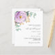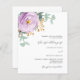 A white background. Decorated with violet, purple florals, roses flowers and green watercolored eucalyptus leaves, sprigs, greenery and a faux gold sprigs. Personalise and add your names be and details.