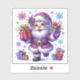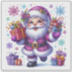 A cheerful Santa character in a vibrant violet outfit joyfully carries colourful presents surrounded by festive decorations. Snowflakes and ornaments float in the air, creating a delightful holiday atmosphere perfect for Christmas celebrations.