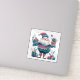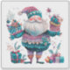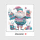 A cheerful festive sticker features a jolly figure adorned in violet and teal patterns, holding beautifully wrapped presents.