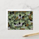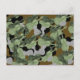 This postcard design displays violins in the atypical colours sage green, black, light grey, and olive green spread over a khaki-coloured background at random, creating what is known as a camouflage pattern, or camo.