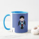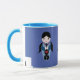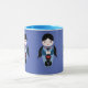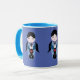 A cute little violin doll on a coffee mug with matching blue handle and interior.