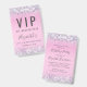 A unique sweet 16 birthday party invitation that also serves as a badge for guests to wear at the party and keep as a souvenir party favour. This pretty design features sparkly holographic purple, pink and silver faux glitter confetti on a pink background, her name in a soft grey trendy script and "VIP All Access Pass" on the top. On the reverse side, personalise the birthday party invitation.