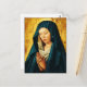 The plain and dark background contrasts with the Virgin's radiant bowed head and the white headdress covering it, and her hands are gently closed together