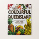 Vintage travel poster promoting Queensland, Australia with an assortment of fruits and flowers from the tropical locale.